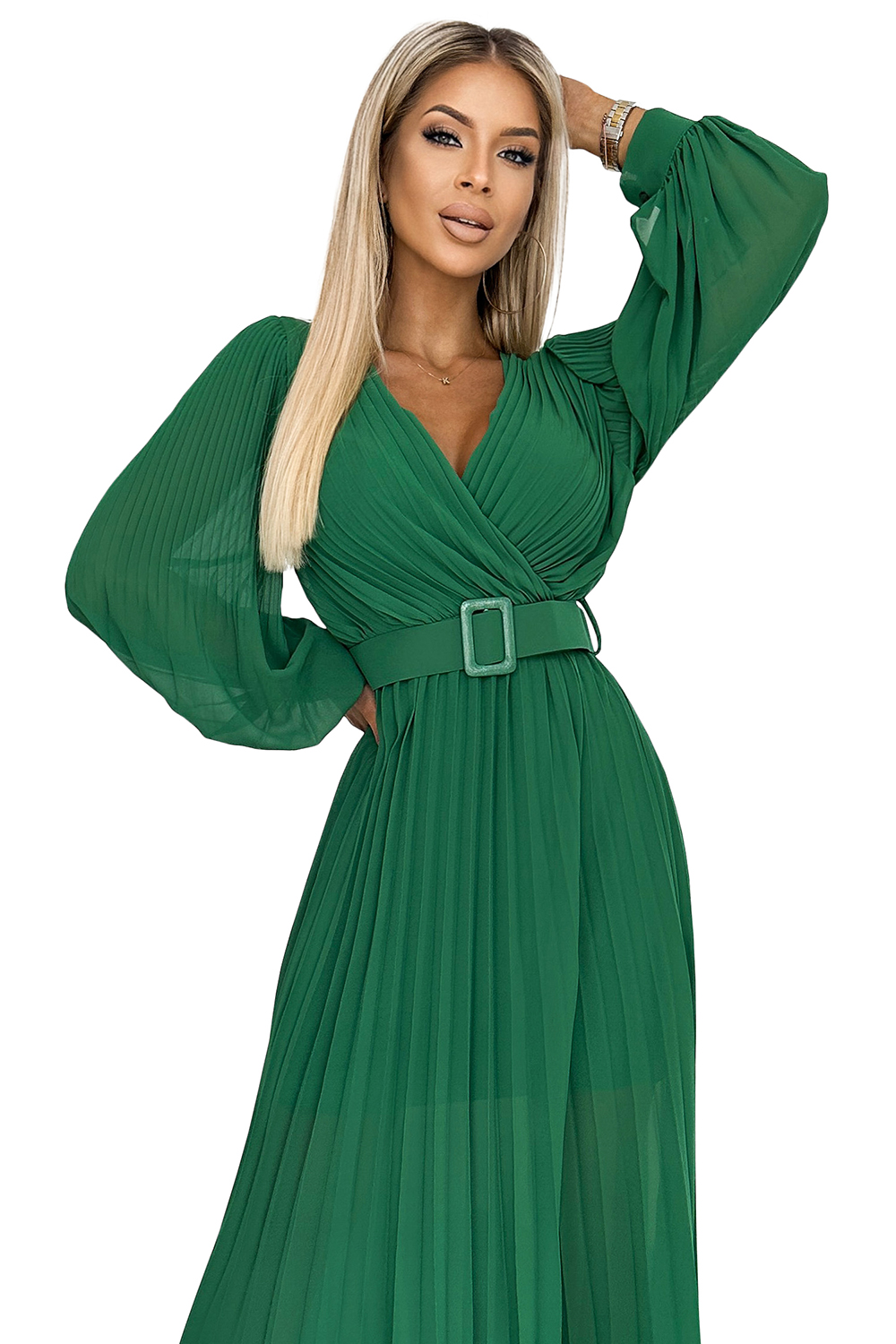 414-3 KLARA susiūta suknelė su diržu ir iškirpte - ŠVIESI ŽALIA