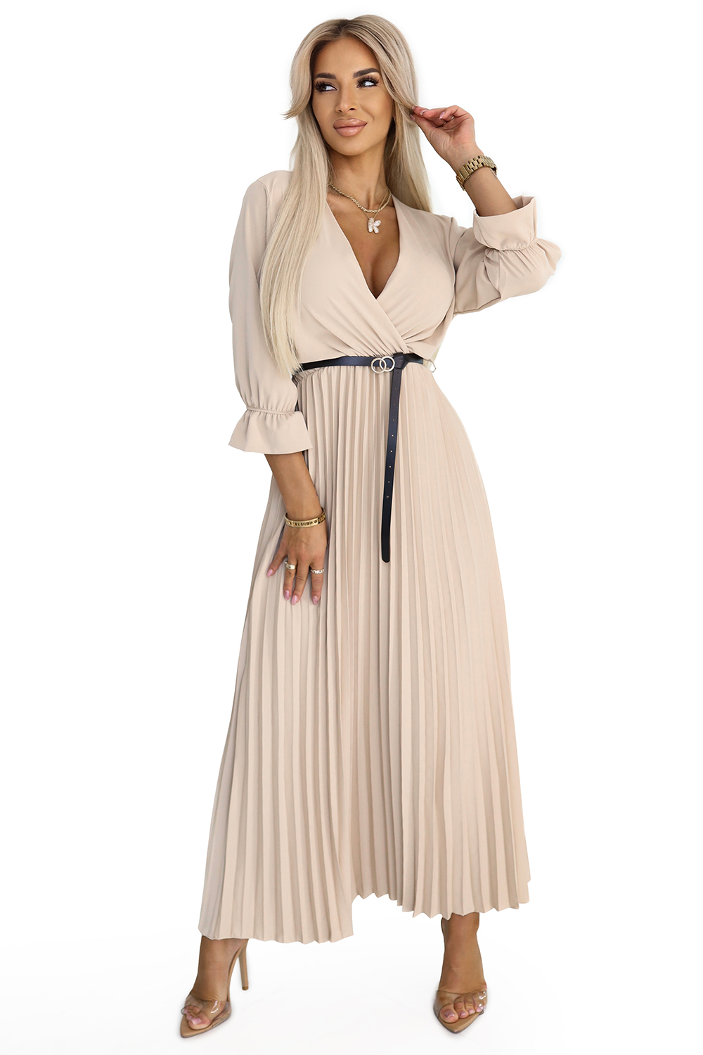462-5 SERENA Klojuota maksi suknelė su iškirpte, diržu ir 3/4 rankovėmis - TAMSI SMĖLIO SPALVOS