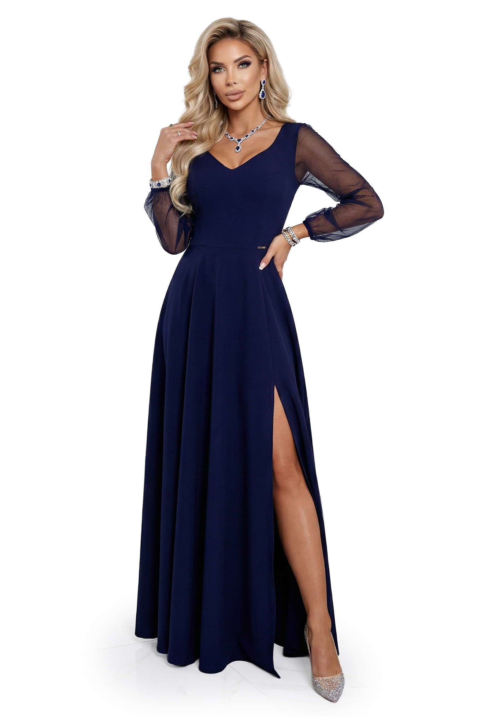 Elegantiška tamsiai mėlyna ilga maksi suknelė su tiulio rankovėmis - jautri klasika iš Numoco