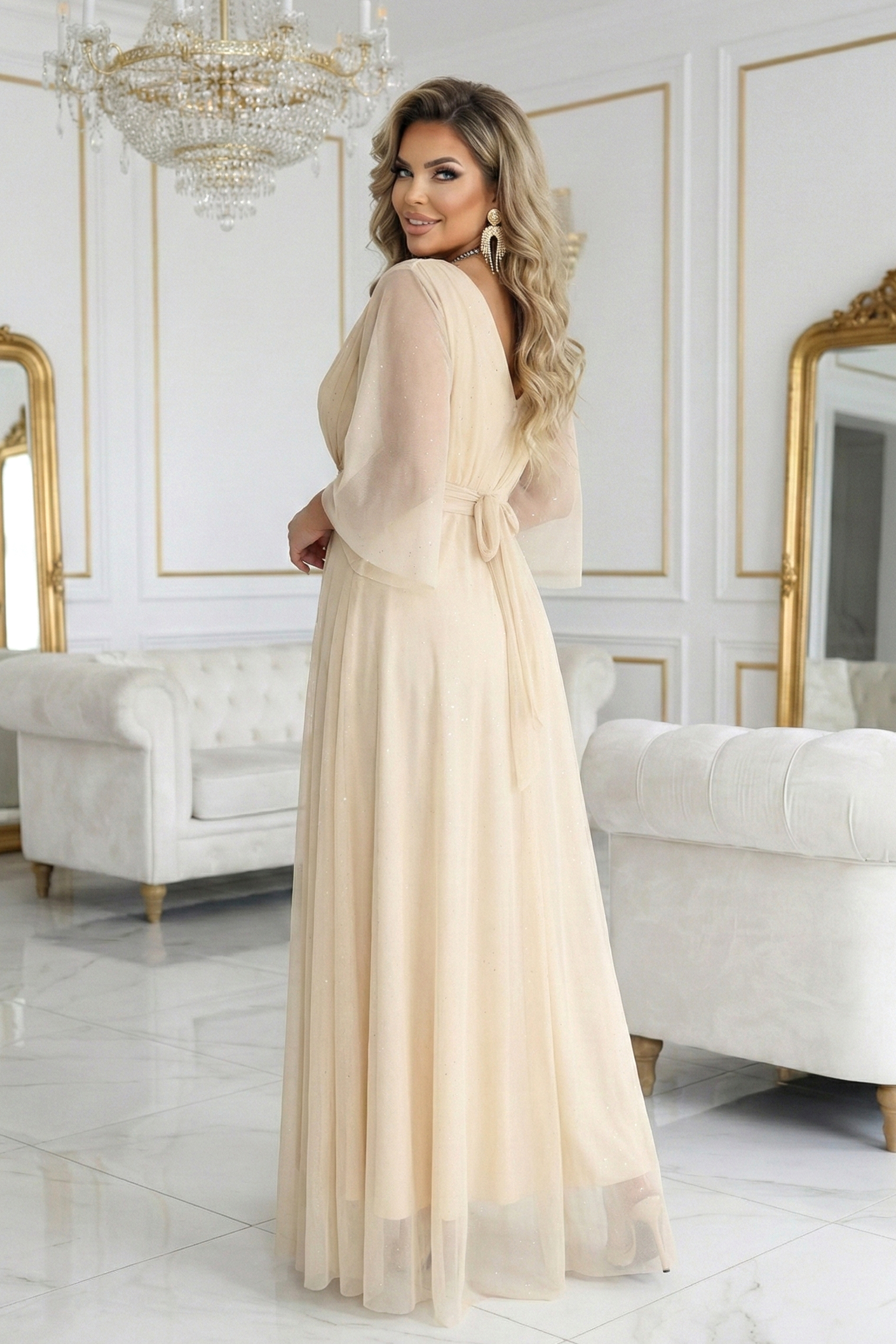 654-2 Ilga, žvilganti, plius dydžio suknelė su apvalia iškirpte ir permatomomis rankovėmis - šampano smėlio spalvos